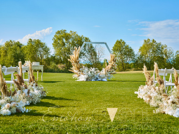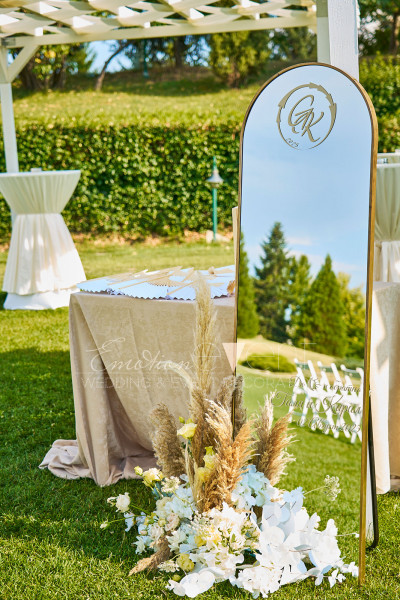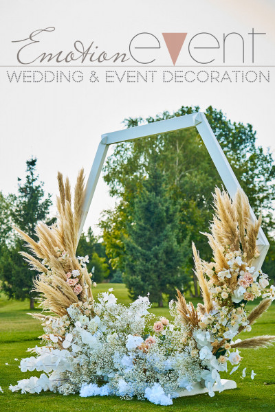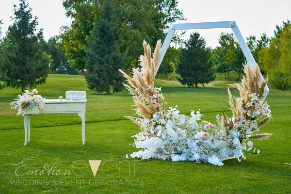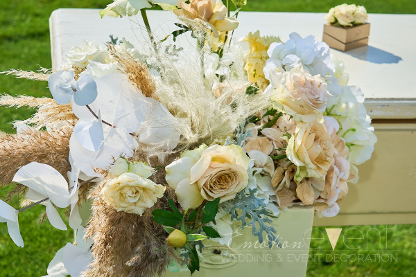 It is made in soft cream and pastel tones, with a subtle play of textures and shapes that perfectly suit the atmosphere at the St. Sofia Golf Club. The composition is a rich arrangement of natural and high-quality artificial flowers, selected to create a feeling of lightness, airiness and absolute elegance. Each element – from delicate roses to fluffy pampas grass – is arranged with care to bring harmony and natural charm.